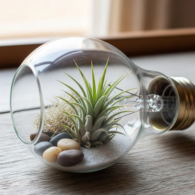 Give burnt-out bulbs new life as tiny terrariums for your air plants! This upcycling project turns waste into whimsical planters that spark conversation. Carefully hollow out old incandescent bulbs (LED bulbs won't work), creating perfect glass vessels for small air plants. Add sand, tiny shells, or colorful gravel to create miniature landscapes inside. Hang them using wire or macramé, or create stands from wire or small rocks. The bulb shape naturally magnifies your air plants, making them appear larger and more detailed. This project combines sustainability with creativity, perfect for eco-conscious decorators. Group several bulb terrariums together for impact, perhaps mixing different bulb sizes. Each one becomes a tiny world, proving that great gardens can come in the smallest packages. Your old bulbs just became the brightest idea in home décor!