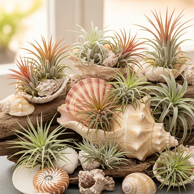 Bring beach vibes home by combining air plants with seashells for displays that whisper of ocean breezes and sandy shores! Large shells like conch, abalone, or giant clams make perfect natural containers for air plants. The calcium from shells can actually benefit the plants, while their natural curves cradle air plants beautifully. Sea urchin shells, with their natural holes, are particularly stunning when filled with small air plants. Create a coastal vignette on your bathroom counter or bedroom dresser using various shells and air plant combinations. The organic shapes and textures complement each other perfectly, while the neutral colors work with any décor. This combination is especially perfect for beach houses or anyone missing their last vacation! Mist your shell gardens occasionally to mimic ocean spray, keeping both the memories and plants alive.