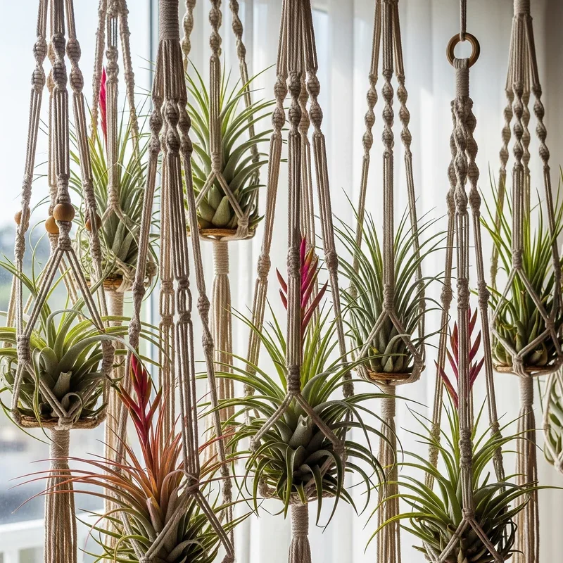 Embrace the boho trend with macramé plant hangers that showcase your air plants in style! These knotted creations add texture and warmth to any room while keeping your plants at eye level where you can fully appreciate them. You don't need traditional pots; simply nestle air plants directly into the macramé webbing or place them in small bowls within the hangers. The natural fibers complement the organic feel of air plants perfectly. Hang them in corners, near windows, or create a stunning room divider with multiple hangers at varying heights. Choose natural cotton for a classic look or experiment with colored cord for a modern twist. The gentle swaying motion actually helps air plants by ensuring good air circulation. Your space gains vertical interest without sacrificing precious floor or surface area!