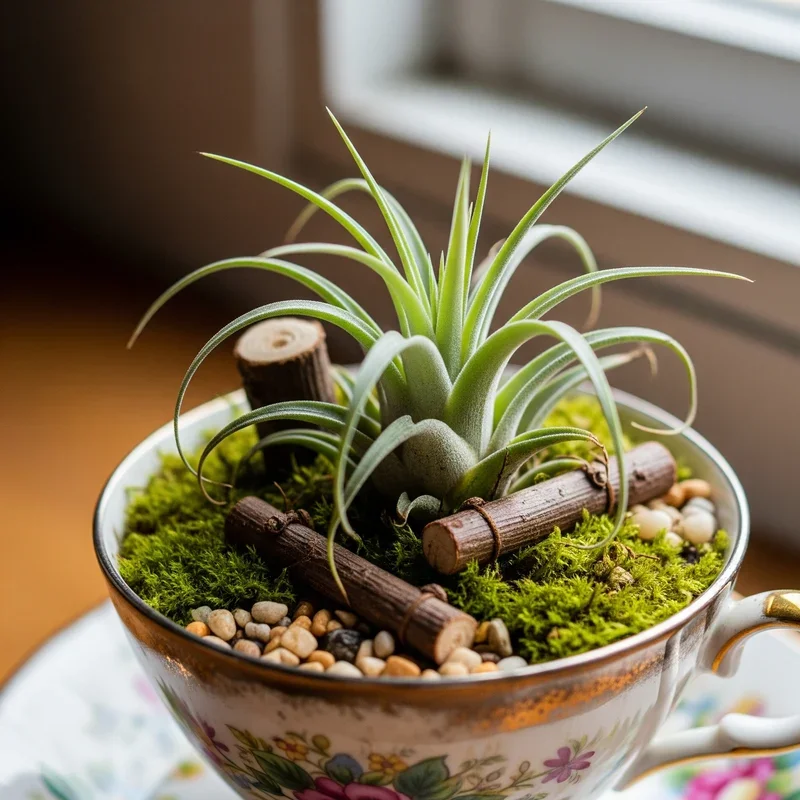 Raid grandma's china cabinet or hit up thrift stores for vintage teacups that deserve a second life as charming air plant homes! These delicate vessels add a touch of whimsy and nostalgia to any space. Mismatched patterns and colors actually enhance the eclectic charm. Place a small air plant in each cup, perhaps adding a bit of preserved moss or tiny pebbles for visual interest. Arrange them on floating shelves, window sills, or create a stunning centerpiece using a vintage serving tray. The contrast between delicate porcelain and wild air plants creates an unexpectedly perfect marriage of refined and natural elements. This idea works especially well for tea lovers or anyone drawn to cottage-core aesthetics. Your afternoon tea setup just became a permanent garden party that never needs watering the soil!