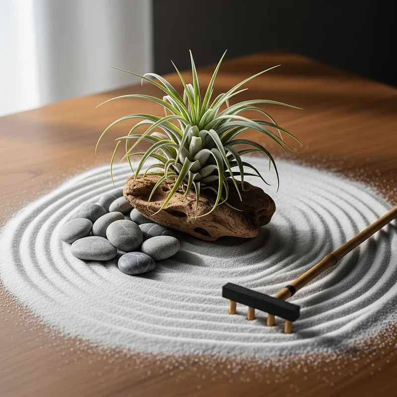 Transform your workspace into a calming oasis with miniature zen gardens featuring air plants! Use shallow wooden trays or ceramic dishes filled with sand, creating patterns with tiny rakes just like traditional zen gardens. Place air plants strategically as living sculptures among smooth stones and mini figurines. The act of rearranging and raking becomes meditative, perfect for stressful workdays. Air plants are ideal for offices since they don't need soil that might spill on important documents. The compact size fits perfectly on desks without overwhelming your workspace. Studies show that plants increase productivity and reduce stress, making this both beautiful and functional. Add a small spray bottle for easy misting during coffee breaks. Your desk just became a mindfulness corner that keeps you centered while adding natural beauty to those long work hours!