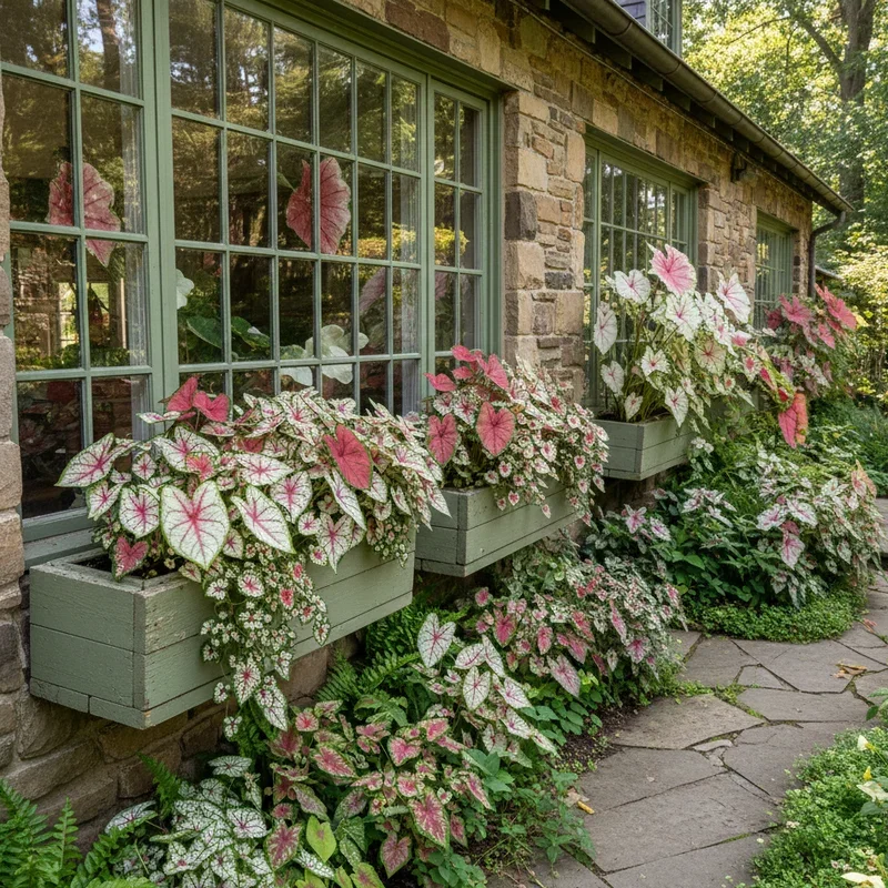 Bring color to eye level with window boxes showcasing compact caladium varieties that transform views from both inside and outside. These elevated plantings put the intricate leaf patterns where they're most appreciated, creating living stained glass effects. Choose dwarf varieties like 'Miss Muffet' or 'Gingerland' that won't overwhelm smaller containers or block windows. You're framing your windows with natural artwork that beats any curtain treatment. The proximity to the house provides extra warmth that extends the growing season slightly. Combine with shade-tolerant annuals like impatiens or begonias for additional texture and occasional flowers. This approach works brilliantly for basement windows that need brightening or kitchen windows where you'll enjoy them while washing dishes. Regular watering is crucial since window boxes dry faster than ground plantings. The intimate scale allows you to appreciate subtle color variations you might miss in larger plantings.