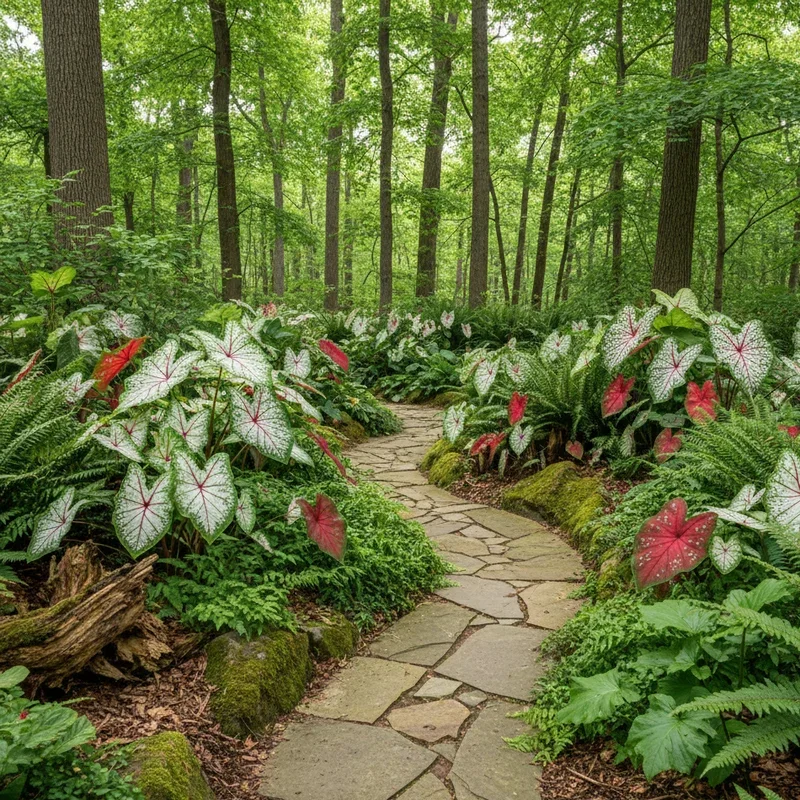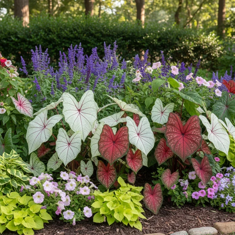 1. Tropical Shade Garden with Mixed Caladium Varieties