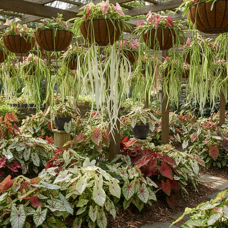 Suspend beauty at eye level with hanging baskets featuring caladiums combined with trailing shade plants for 360-degree impact. These aerial displays maximize vertical space while creating intimate garden rooms below. Select compact varieties and pair with cascading plants like trailing begonias or ivy for balanced compositions. You're essentially creating floating gardens that add dimension to flat landscapes. The elevated position improves air circulation, reducing disease issues common in humid conditions. Hanging baskets work particularly well on covered porches, gazebos, or shepherd's hooks along pathways. This approach allows renters to create substantial gardens without altering landscapes. Use self-watering baskets to reduce maintenance, especially important for elevated plantings that dry quickly. The movement of hanging baskets in breezes adds dynamic element to static garden designs. Position at varying heights for layered effect that draws eyes upward.