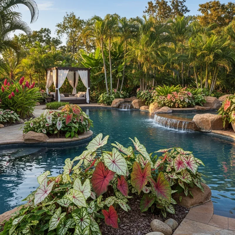 Create a tropical oasis around your pool with caladiums that thrive in the humid microclimate while adding resort-style glamour. These moisture-loving plants naturally suit poolside conditions, reflecting in the water for doubled visual impact. Choose bold varieties with splashy patterns that hold their own against bright pool tiles and furniture. You're designing a vacation destination in your own backyard, where every day feels like a getaway. Position them where they won't drop leaves directly into the pool but close enough to benefit from splash zone humidity. The large leaves provide textural contrast to typical poolside palms and grasses. This placement particularly suits covered pool areas where shade is abundant. Mix with tropical plants like bird of paradise or canna lilies for authentic resort landscaping. The reflection of colorful caladium leaves in pool water creates an ever-changing art installation.