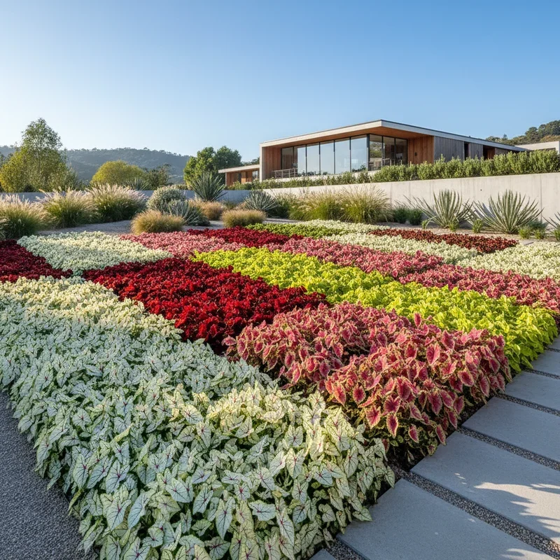 Embrace contemporary design with geometric color blocks using single caladium varieties planted in defined sections. This modern approach creates bold statements that suit minimalist gardens and architectural landscapes perfectly. Use hardscaping or steel edging to define precise shapes filled with uniform caladium varieties. You're treating plants like paint swatches in a living color field painting. The simplicity of design allows individual varieties' unique characteristics to shine fully. This technique works especially well in courtyard gardens or along modern home foundations. Choose high-contrast varieties for maximum impact or subtle variations for sophisticated restraint. The organized layout makes maintenance easier with clear boundaries between varieties. Photograph from above to appreciate the geometric patterns created by your design. This approach particularly appeals to those who prefer order and structure in gardens.