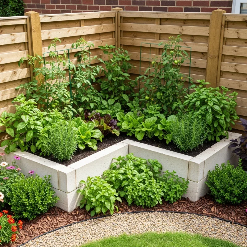 Make your corner work harder by installing raised beds dedicated to growing your own food. Build beds at varying heights to create visual interest and make gardening easier on your back. Use materials like cedar, stone, or galvanized steel that complement your home's style. Organize plants by height and sun requirements, placing tall plants like tomatoes and pole beans on the north side to avoid shading shorter crops. Include flowers like marigolds and nasturtiums for pest control and visual appeal. Add a small compost bin discretely tucked behind taller plants to create a complete sustainable system. Install a drip irrigation system to ensure consistent watering, and consider adding a small greenhouse or cold frame to extend your growing season.