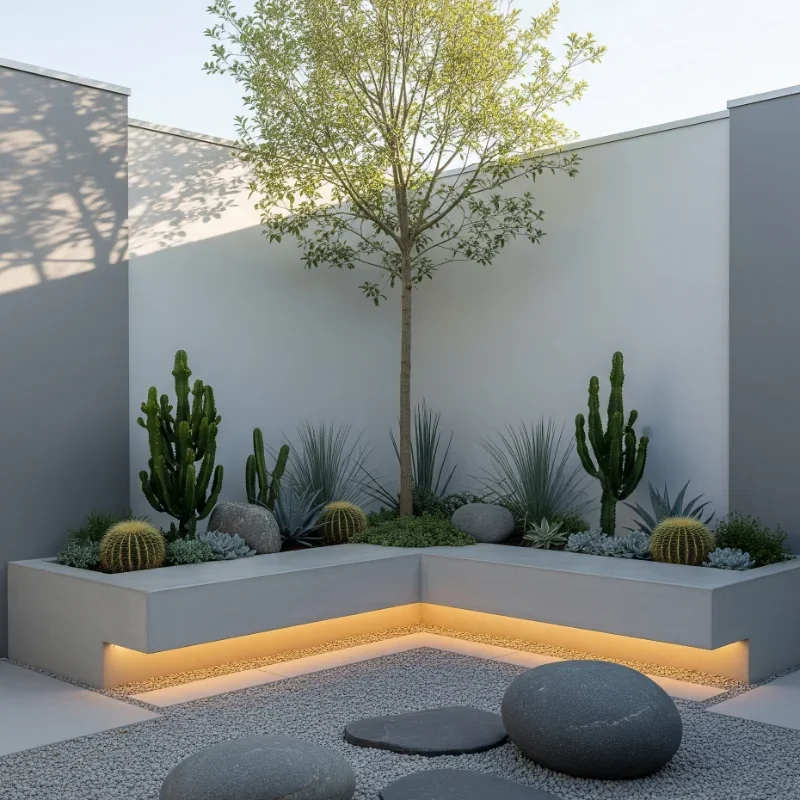 Embrace contemporary design by creating a corner garden that celebrates clean lines, geometric shapes, and a limited plant palette. Use materials like cor-ten steel, concrete planters, or sleek wooden boxes to create raised beds or borders. Plant architectural specimens like ornamental grasses, bamboo, or sculptural succulents in repetitive patterns. Include a single statement plant like a Japanese maple or large agave as a focal point. Add modern outdoor furniture or a geometric water feature to enhance the contemporary feel. Keep the color palette simple with mostly greens and grays, adding perhaps one bold color as an accent. Maintain crisp edges between planted areas and hardscaping, and consider adding LED strip lighting to highlight key features at night.