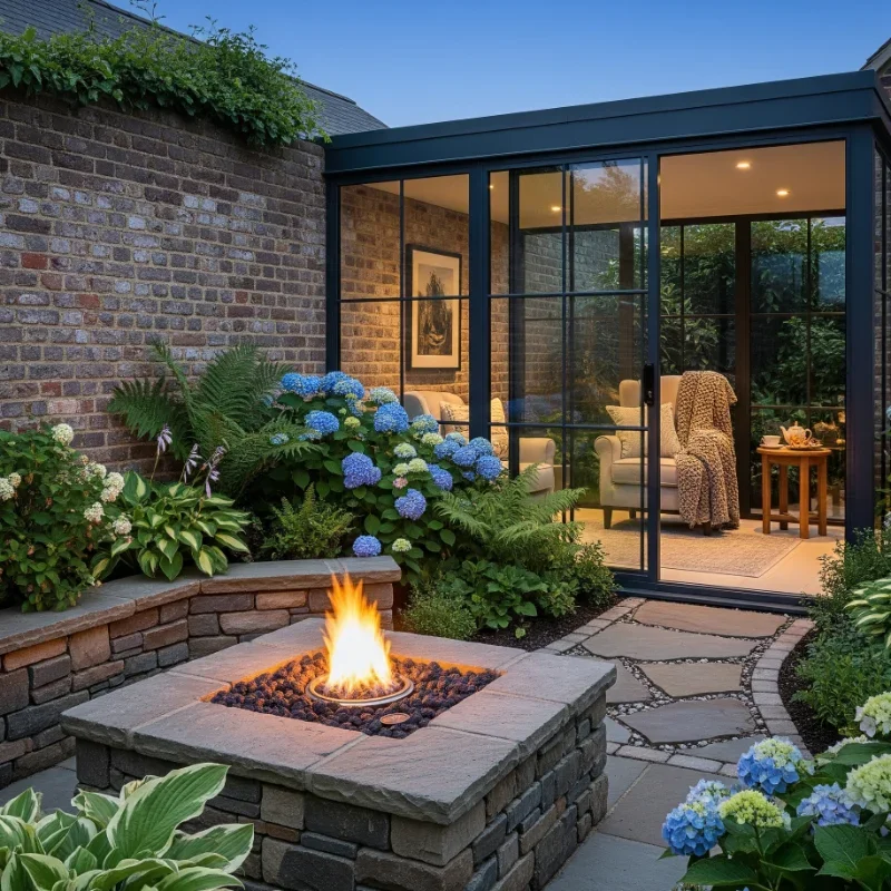 Transform your corner into an outdoor room centered around a fire pit for year-round entertaining. Install a circular or square fire pit with built-in seating or arrange comfortable outdoor furniture around it. Create privacy with tall plantings like arborvitae or bamboo, or install a decorative screen or trellis with climbing plants. Add outdoor lighting through string lights, lanterns, or uplighting for ambiance. Plant fragrant evening bloomers like four o'clocks or night-blooming jasmine to enhance the sensory experience. Include storage for firewood disguised as a decorative element, and consider adding a small side table or bar area for refreshments. Choose fire-resistant plants for areas closest to the pit, and maintain a clear zone of gravel or pavers for safety.