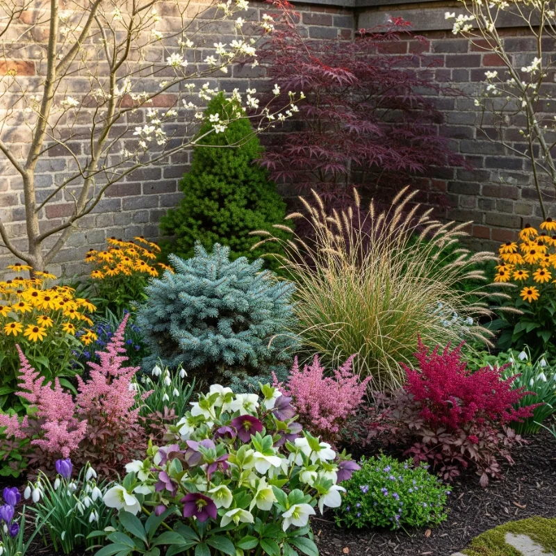 Design your corner to shine throughout the year by carefully selecting plants that offer interest in every season. Start with evergreen shrubs as your backbone, then add spring bulbs like daffodils and tulips for early color. Include summer-blooming perennials like daylilies and rudbeckia, followed by fall stars like asters and ornamental grasses that look stunning with frost. Don't forget plants with interesting bark or structure for winter appeal, such as red twig dogwood or contorted filbert. Add a decorative element like a sculpture or large boulder that provides constant interest regardless of season. Consider plants with multiple seasons of interest, like serviceberry, which offers spring flowers, summer berries, fall color, and attractive winter bark.