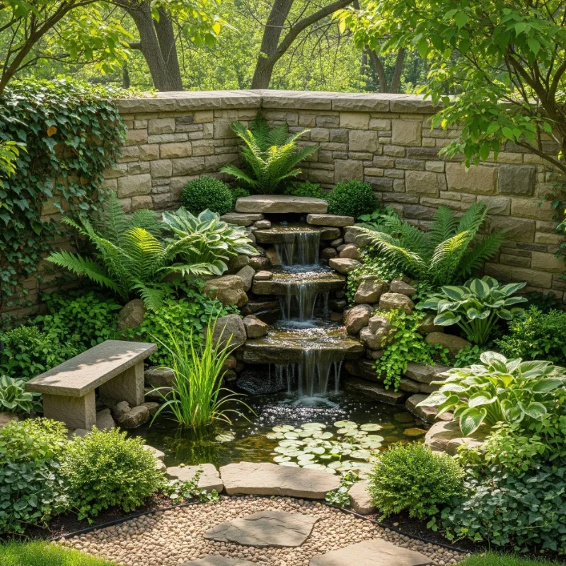 Transform your corner into a soothing retreat by incorporating a water feature that becomes the star attraction. Whether you choose a small pond, a bubbling rock fountain, or a contemporary water wall, the sound and movement of water instantly elevates any space. Surround your water feature with moisture-loving plants like Japanese iris, water lilies, or marsh marigolds if you opt for a pond. For fountains, complement with tropical-looking plants like cannas or elephant ears. Add underwater lighting for evening ambiance and consider including fish if your feature is large enough. Position seating nearby to fully enjoy the calming effects. The reflection and movement of water also help make small corners appear larger and more dynamic.