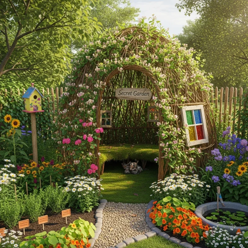 Create magic for young ones by designing a corner specifically for play and imagination. Build a small teepee or install a canopy to create a cozy hideout surrounded by tall sunflowers or corn stalks for natural walls. Include sensory plants like lamb's ear for touch, lemon balm for smell, and snapdragons for interactive fun. Add stepping stones painted with numbers or letters for educational play. Plant a pizza garden with tomatoes, basil, and peppers, or a rainbow garden organized by color. Include child-sized garden tools and a small potting bench where kids can get their hands dirty. Consider adding wind chimes, colorful flags, or painted rocks to enhance the whimsical atmosphere. Make sure all plants are non-toxic and avoid anything with thorns.