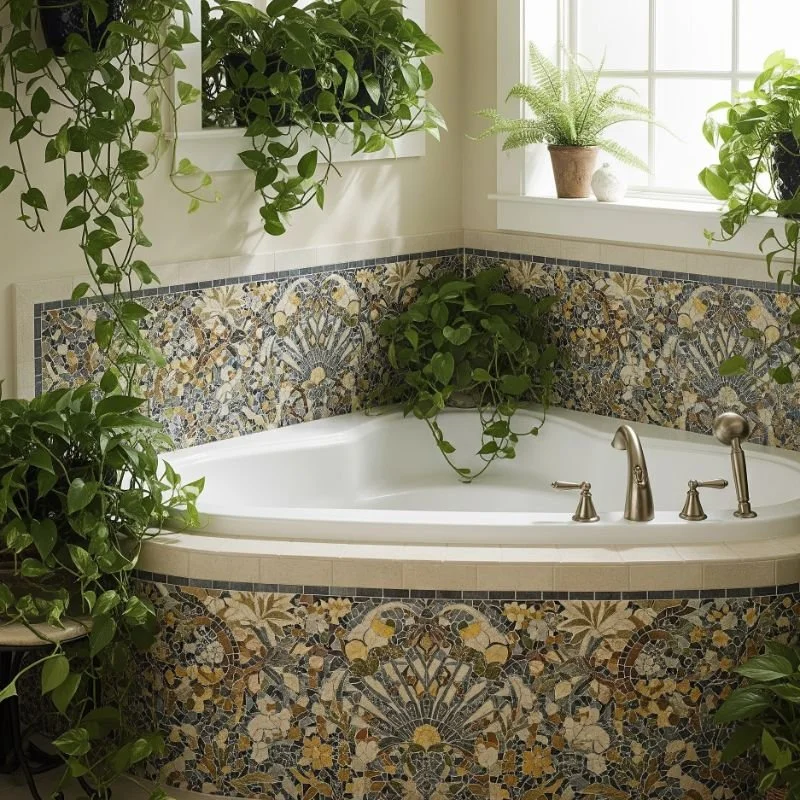 Design a stunning tile mosaic backsplash that serves as artistic backdrop for your corner garden tub while protecting walls from water damage. Mix materials like glass, ceramic, and natural stone tiles to create patterns ranging from simple borders to elaborate murals. Choose colors that complement your overall bathroom palette while adding visual interest. It's like painting with tiles instead of brushes! The mosaic can extend from tub edge to ceiling for maximum impact or stay contained as an accent strip. Include special tiles like mother-of-pearl or metallic accents for catching light beautifully. Seal grout properly to maintain the mosaic's beauty over time. This permanent decoration adds value while expressing your personal style through unique pattern combinations.