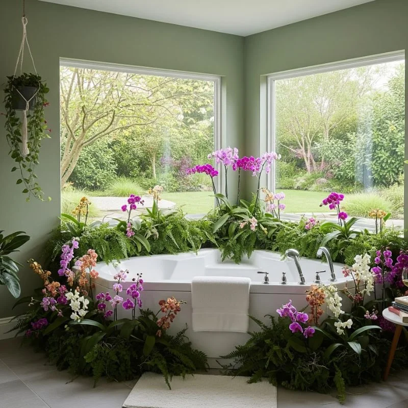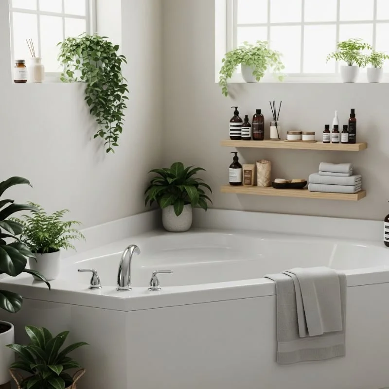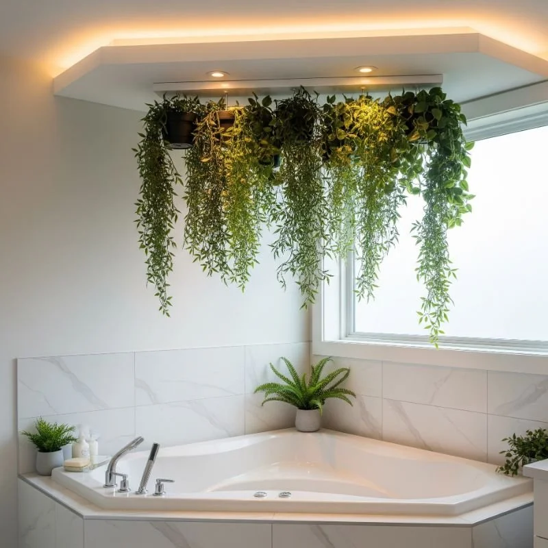 Create a hanging garden above your corner garden tub with ceiling-mounted planters that add vertical interest without consuming floor space. Use macramé hangers, decorative chains, or sleek modern systems to suspend plants at varying heights. Choose trailing varieties like pothos, spider plants, or string of pearls that create a cascading green canopy. It's like bathing under a living chandelier! Ensure mounting hardware is securely anchored to support weight when plants are watered. Position plants to avoid dripping directly into the tub while maintaining the overhead garden effect. This unique approach draws eyes upward, making ceilings feel higher while adding organic beauty. The movement of hanging plants adds dynamic element to otherwise static bathroom spaces.