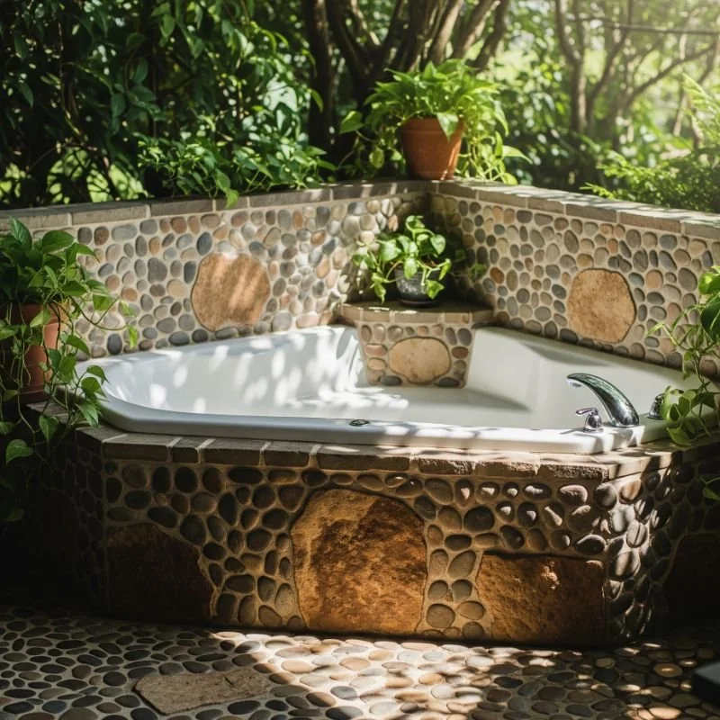 Elevate your corner garden tub's sophistication by adding natural stone elements that bring earthly elegance to the space. Consider a stone accent wall behind the tub using stacked slate, river rock, or marble tiles that create a stunning focal point. Natural stone soap dishes, decorative bowls, and even small sculptures add organic texture and luxury. It's like bringing a piece of mountain spa into your home! The varied patterns and colors in natural stone ensure each installation is unique. Stone's durability and water resistance make it perfect for bathroom environments. Mix smooth and rough textures for visual interest, perhaps combining polished marble accessories with a rough-hewn granite accent. The natural elements ground the space while adding timeless appeal that never goes out of style.