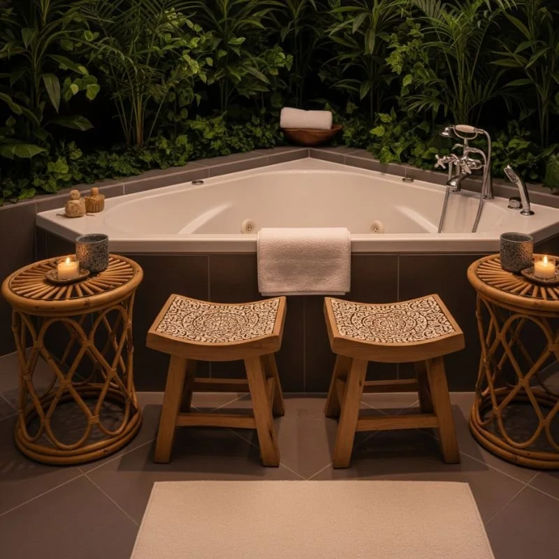 Enhance both function and style by positioning beautiful stools or small tables near your corner garden tub for convenience and visual appeal. Choose water-resistant materials like teak, metal, or treated wicker that withstand bathroom humidity while looking elegant. These pieces hold towels, books, beverages, or decorative items within easy reach. It's like having bathroom furniture that's both pretty and practical! Vintage stools add character while modern designs maintain clean lines. Nesting tables offer flexibility, expanding surface area when needed. Consider storage ottomans that hide bath products while providing seating. The key is selecting pieces that enhance your décor theme while serving genuine purposes. These additions make your tub area feel like a complete, thoughtfully designed space.