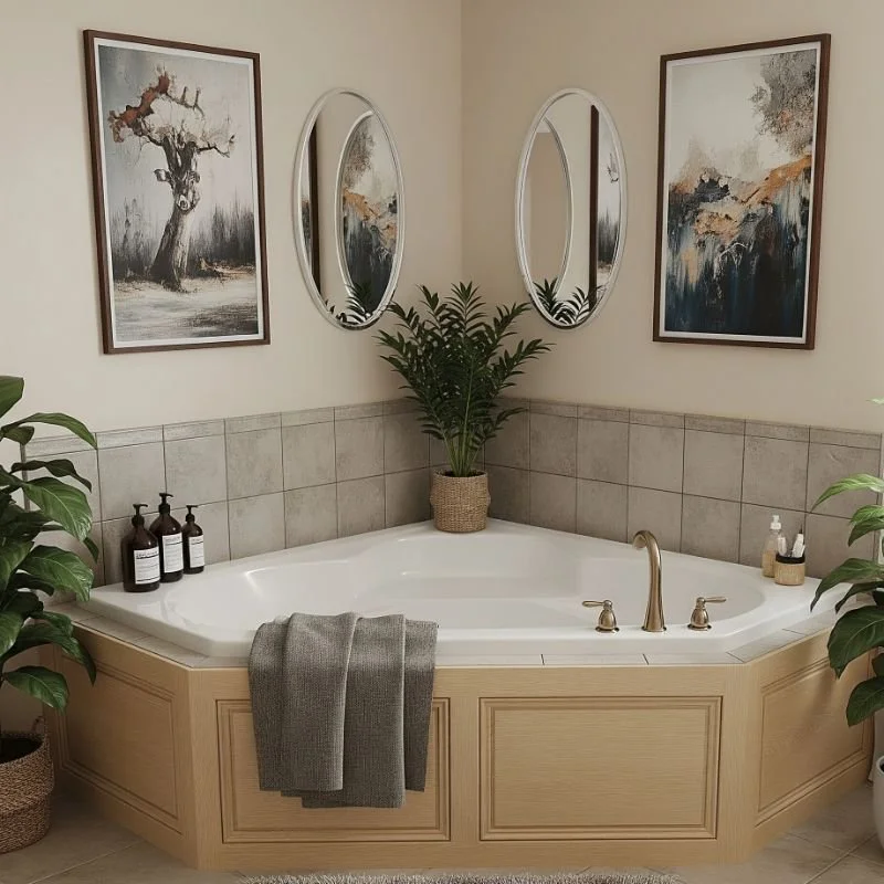 Transform blank walls around your corner garden tub into a personal gallery that entertains and inspires during long soaks. Choose moisture-resistant frames and position artwork where it can be enjoyed from the tub without risk of water damage. Mirrors amplify natural light and create the illusion of more space while reflecting beautiful views. It's like curating your own private museum! Mix sizes and styles for an eclectic look or maintain consistency for a more formal approach. Consider rotating seasonal artwork to keep the space fresh. Position mirrors to reflect windows or attractive features rather than less appealing areas. Abstract water-themed art or calming nature scenes work particularly well in bathroom settings. The key is selecting pieces that withstand humidity while contributing to your desired ambiance.