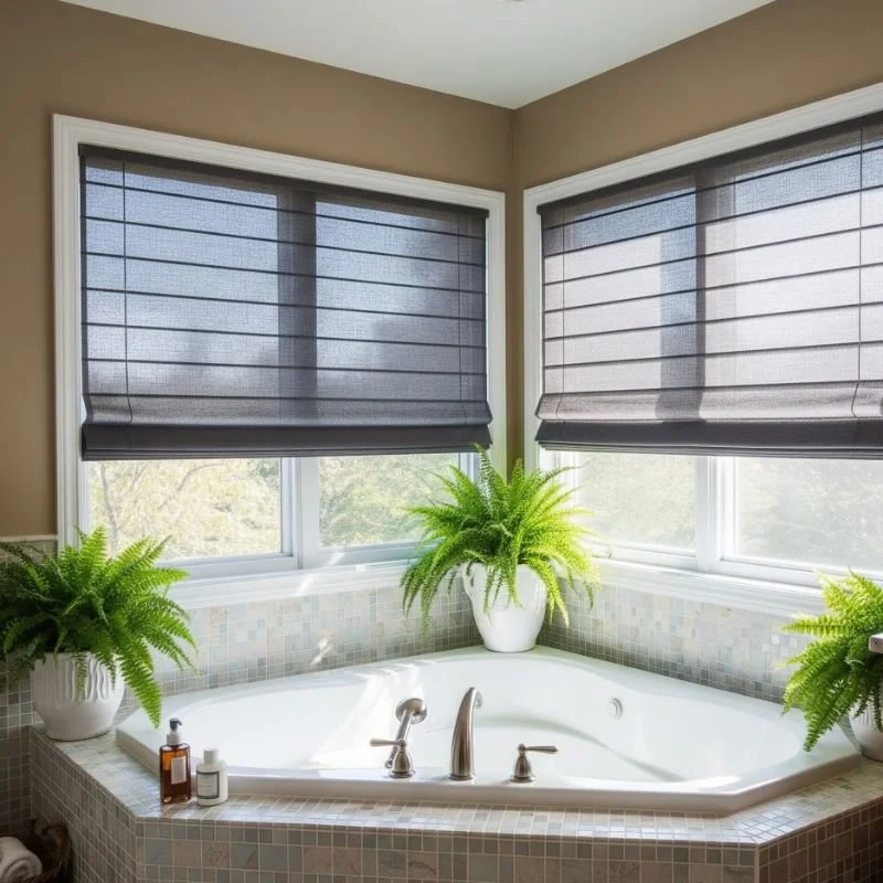 Dress up windows near your corner garden tub with water-resistant treatments that balance privacy with natural light. Options like faux wood blinds, cellular shades, or moisture-resistant Roman shades offer adjustable coverage for different times of day. Top-down bottom-up shades work particularly well, allowing light from above while maintaining privacy at tub level. It's like having adjustable walls of light! Choose materials and colors that complement your bathroom's décor while standing up to humidity. Sheer curtains layered with heavier drapes provide flexibility for creating different moods. For a luxurious touch, add valances or cornices that frame the window beautifully. Consider motorized options for hard-to-reach windows, making adjustments effortless even from the tub. The right window treatments transform harsh sunlight into gentle, filtered illumination perfect for relaxation.
