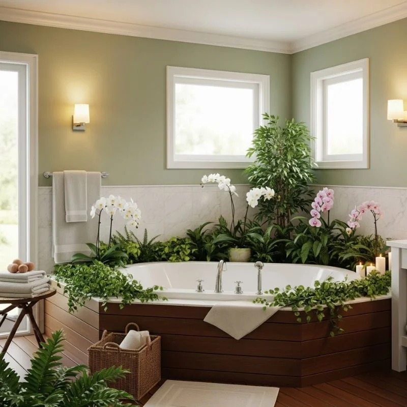 Transform your corner garden tub area into a tropical oasis by strategically placing moisture-loving plants around the perimeter. Choose varieties like peace lilies, ferns, orchids, and pothos that thrive in humid bathroom environments. Vary plant heights using decorative stands or hanging planters to create visual layers that draw the eye upward. It's like bringing a slice of rainforest into your bathroom! The greenery not only purifies the air but also creates a natural privacy screen while you bathe. Position larger plants in corners to soften angular spaces and smaller specimens on the tub ledge for easy access to their calming presence. Consider self-watering planters to maintain healthy plants with minimal effort. The living elements add organic beauty that changes and grows, making your bathroom feel alive and refreshing.