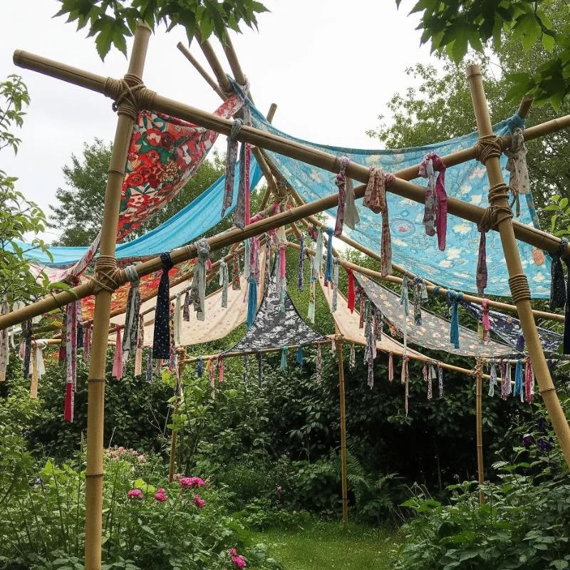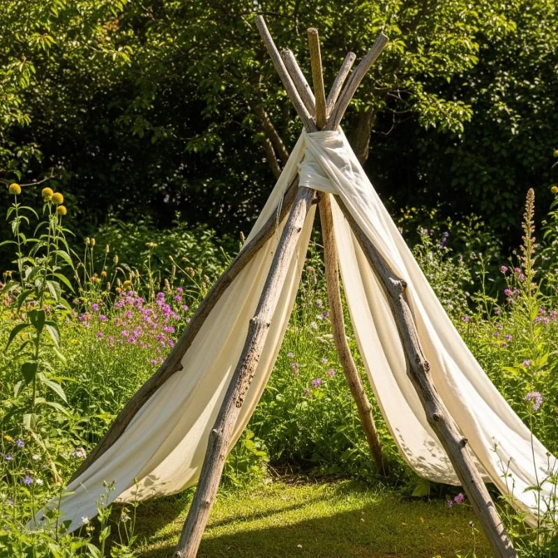 Construct a whimsical teepee using long branches and outdoor fabric for a natural shade structure that delights both kids and adults. Gather straight branches at least 8 feet long, lash together at the top, and spread the base for stability. Wrap with weather-resistant fabric, leaving an entrance opening. This primitive design provides surprisingly effective shade while adding artistic flair. It's like creating a shaded fort from forest materials! The conical shape sheds rain while the fabric blocks sun. Decorate with lights or natural materials for enhanced appeal. This temporary structure moves easily to follow shade needs or protect different garden areas. The DIY nature makes this a great family project. Scale up or down based on available space and intended use.