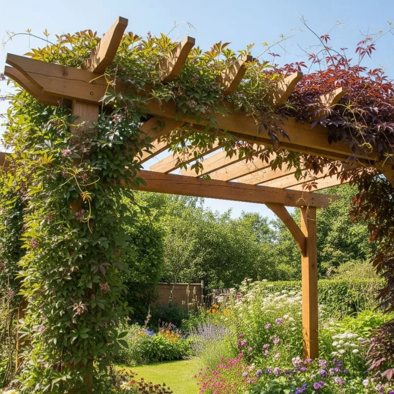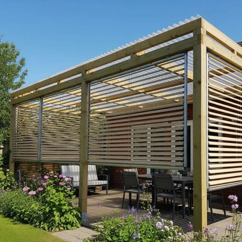 Build a timeless pergola that serves double duty as both structural shade and a support system for climbing plants. Start with pressure-treated lumber or cedar for weather resistance, creating a basic frame with posts and crossbeams. The magic happens when you plant fast-growing vines like wisteria, grape, or jasmine at each post. Within a season or two, you'll have living shade that changes with the seasons. It's like creating a green ceiling for your outdoor room! The initial construction requires basic carpentry skills and a weekend of work. Space your crossbeams to create dappled shade, allowing some light while blocking the harshest rays. This permanent structure adds property value while solving your shade problem naturally. Plus, flowering vines attract pollinators and create a romantic garden atmosphere.