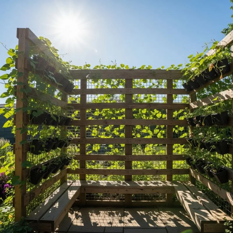 Repurpose wooden pallets into a trendy vertical shade structure that doubles as a display space for hanging plants. Stand pallets upright and secure them together to create walls or angles that block afternoon sun. Paint or stain them for a polished look, or leave natural for rustic charm. Add hooks for hanging baskets, turning your shade wall into a vertical garden. It's like getting shade and storage in one free package! Position strategically to protect seating areas or tender plants from harsh sun. The slatted design allows air circulation while blocking direct rays. This budget-friendly option requires minimal tools and expertise. Combine multiple pallets for larger coverage or create moveable sections for seasonal adjustments. The industrial-chic aesthetic suits modern gardens perfectly.