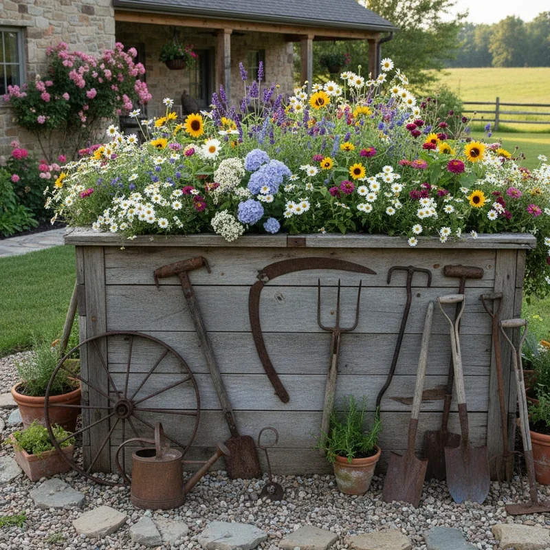 Incorporate vintage farm tools as decorative elements within flower beds, creating gardens that tell stories of agricultural heritage! Lean old rakes against fence posts, position antique plows as focal points, or use worn hoe heads as unique plant markers. These weathered tools add vertical interest and historical context that connects modern gardens to farming traditions. The rusty patina of old metal contrasts beautifully with fresh green foliage and bright blooms, creating visual tension that keeps eyes engaged. Group tools thoughtfully rather than scattering randomly, creating vignettes that feel intentional rather than cluttered. Clean tools enough to prevent rust from damaging plants but maintain authentic aging that gives them character. This approach transforms flower beds into outdoor museums that celebrate both natural beauty and human craftsmanship.