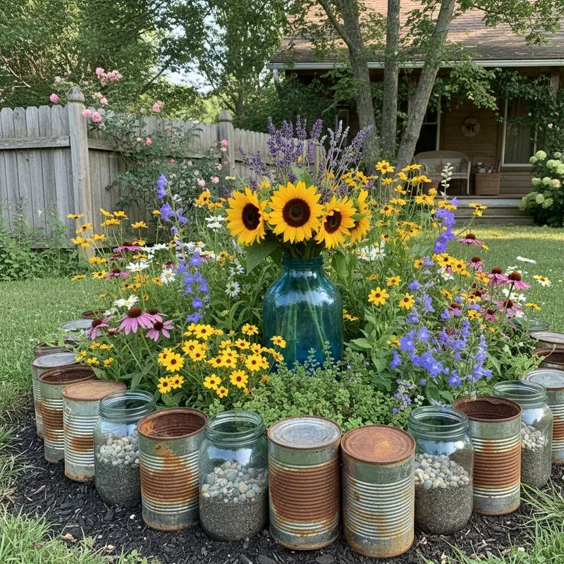 Create whimsical flower bed borders using mason jars or tin cans that add sparkle and vintage charm to garden edges! Bury containers partially in soil with openings facing outward, creating unique borders that can hold small plants or decorative elements. Fill jars with solar lights for magical evening illumination or use them as mini vases for cut flower displays. The glass of mason jars catches sunlight beautifully while tin cans develop attractive rust patina over time. Alternate container sizes and types for playful borders that feel collected rather than purchased. This affordable approach lets you experiment with different looks without major investment, perfect for renters or gardeners who enjoy changing designs seasonally. The unexpected use of everyday containers adds personality that makes farmhouse gardens feel personal and creative.