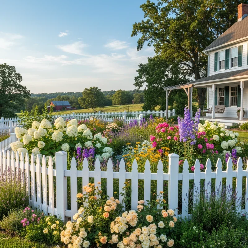 Frame your flower beds with classic white picket fencing that provides the perfect backdrop for colorful blooms while defining garden spaces! These low fences create intimate garden rooms, keeping flowers contained while maintaining open sight lines across your yard. Plant climbing roses or clematis along fence lines, training them to weave through pickets for romantic vertical interest. The crisp white paint makes every flower color pop, from soft pastels to vibrant jewel tones that might otherwise compete with each other. Weather-worn sections add authenticity; don't rush to repaint every chip or peel that develops naturally. Position picket-bordered beds along property lines for charming curb appeal or use them to separate vegetable gardens from ornamental areas. The timeless appeal of white picket fences ensures your farmhouse flower beds never look dated.
