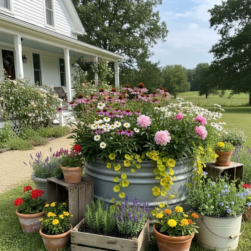 Repurpose vintage galvanized washtubs, buckets, and feed troughs into charming flower beds that scream farmhouse style! These metal containers offer excellent drainage when you drill holes in the bottom, while their weathered surfaces add authentic agricultural charm. Group different sized containers for visual impact, filling them with cascading petunias, cheerful zinnias, and trailing sweet potato vines. The portability of container gardens lets you rearrange displays seasonally or move plants to follow sun patterns throughout the day. Stack smaller buckets on hay bales or wooden crates to create height variation that adds dimension to flat spaces. The silvery-gray metal complements every flower color while reflecting heat away from roots during scorching summers. These containers work especially well for renters who want farmhouse charm without permanent landscape changes.