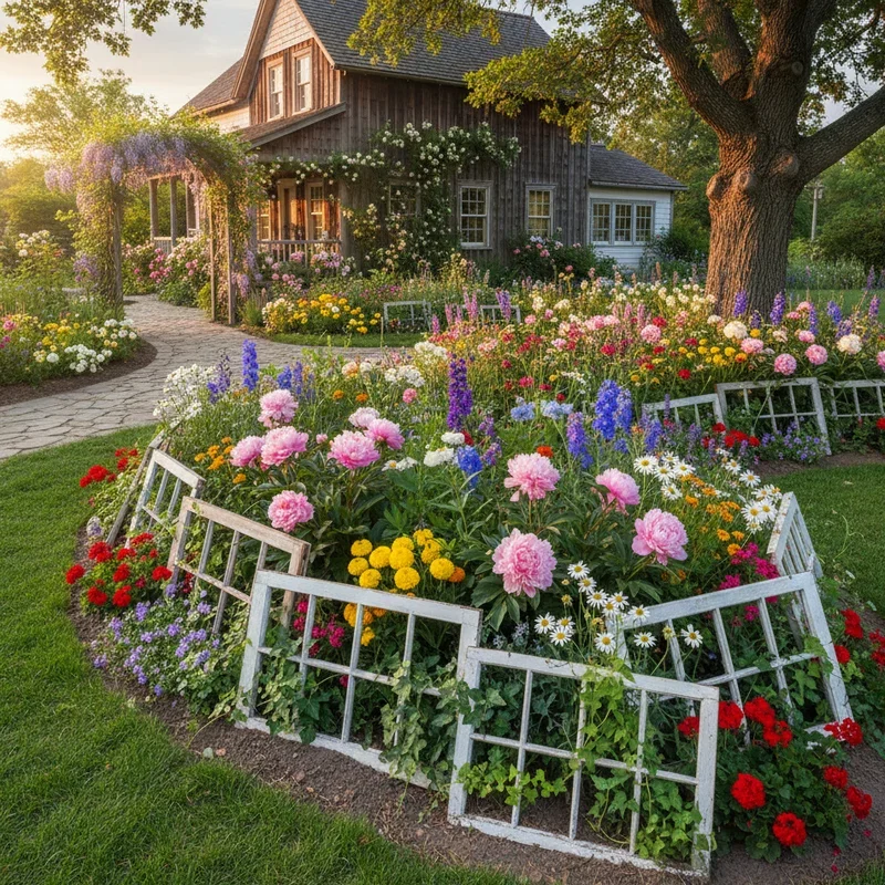 Repurpose vintage window frames as unique garden edging that adds architectural interest while defining flower bed boundaries! Partially bury frames along bed edges, creating see-through borders that separate spaces without blocking views. Paint frames in soft pastels or leave them weathered for authentic farmhouse appeal that develops more character over time. The grid pattern of window panes creates interesting shadows and frames garden views like living artwork. Stack frames at angles for dimensional borders or lay them flat as stepping stones through flower beds. Remove glass for safety or leave intact for greenhouse-effect in small planting pockets. This creative recycling approach appeals to environmentally conscious gardeners while adding unexpected elements that make gardens memorable.