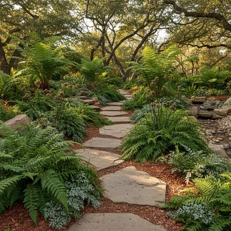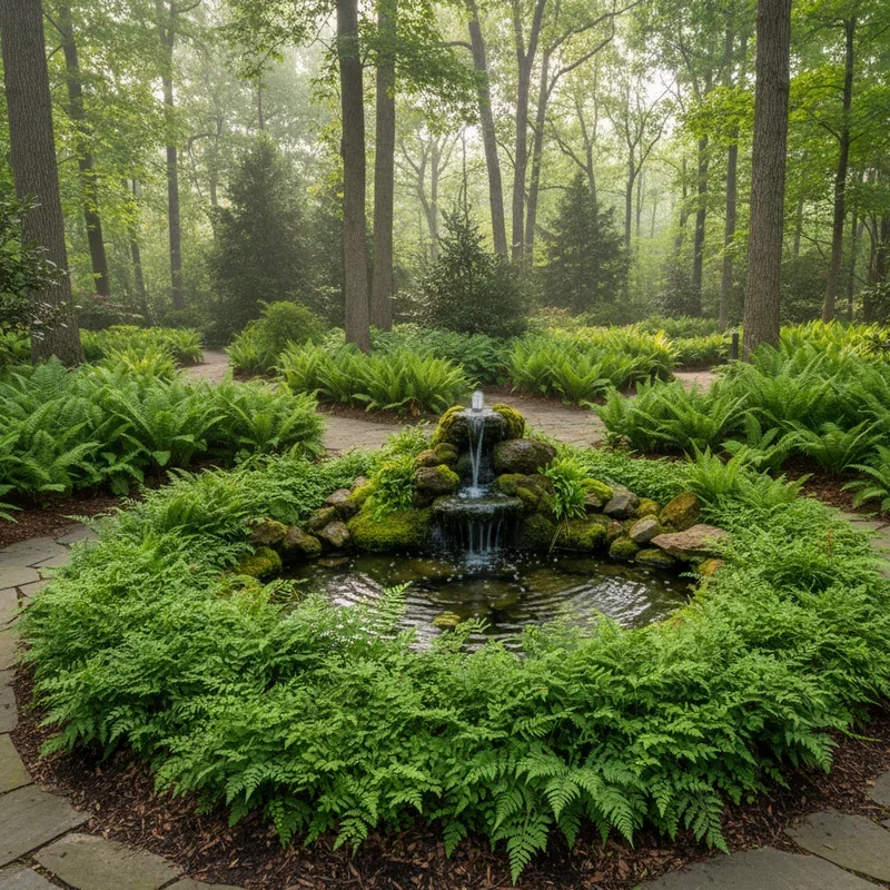 Enhance ponds, streams, and fountains with moisture-loving ferns that thrive in the humid conditions water features naturally create. Plant royal ferns and cinnamon ferns along water edges where their roots can access constant moisture without being waterlogged. Use lady ferns to soften hardscape edges around formal water features, creating seamless transitions between built and natural elements. Position ferns to frame views of water, drawing eyes toward fountains or waterfalls while hiding pumps and equipment. Include bog plants alongside ferns for diverse textures that mimic natural waterside plant communities. Add rocks of varying sizes among ferns to prevent erosion while creating naturalistic stream bank appearances. Illuminate ferns and water with underwater or uplighting for magical evening effects. Your water feature borders become lush green frames that enhance the soothing qualities of moving water while creating habitat for frogs and dragonflies.