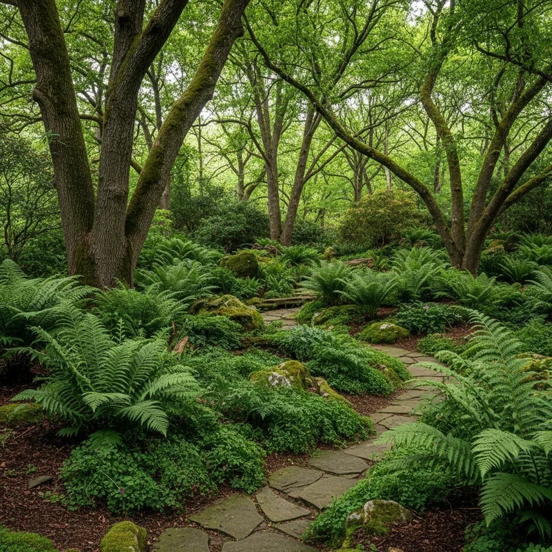 Solve the challenging problem of bare ground beneath trees by establishing fern carpets that thrive in dry shade where grass fails. Select tough varieties like Christmas ferns and wood ferns that tolerate root competition and periodic drought once established. Plant in autumn when tree roots are less active and rainfall helps establishment before spring growth begins. Amend soil with compost to improve moisture retention and provide nutrients in root-competitive zones. Create rivers of ferns that flow around tree trunks, suggesting natural woodland streams made entirely of green fronds. Mix fern species for textural variety that prevents monotony while ensuring coverage if one variety struggles. Allow fallen leaves to remain as natural mulch that feeds ferns while suppressing weeds. Your under-tree carpet transforms problem areas into assets, creating seamless transitions between lawn and tree that look intentionally designed.