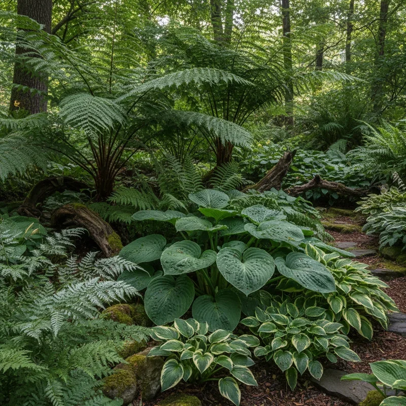 Partner ferns with hostas to create sophisticated shade gardens where contrasting textures and forms provide year-long interest without flowers. Pair fine-textured ferns like Japanese painted ferns with bold-leaved hostas for dramatic textural contrasts that catch the eye. Use tall ferns as backdrops for mounding hostas, creating layered displays with clear vertical structure. Choose color-coordinated combinations like silver-touched ghost ferns with blue hostas for monochromatic elegance. Plant ferns between hostas to fill gaps and provide movement among static hosta mounds. Include variegated varieties of both plants to brighten shade without relying on blooms for color. Time plantings so emerging fern fronds coincide with hosta emergence for synchronized spring displays. Your mixed plantings prove that foliage alone can create gardens as visually exciting as any flower border while requiring less maintenance.