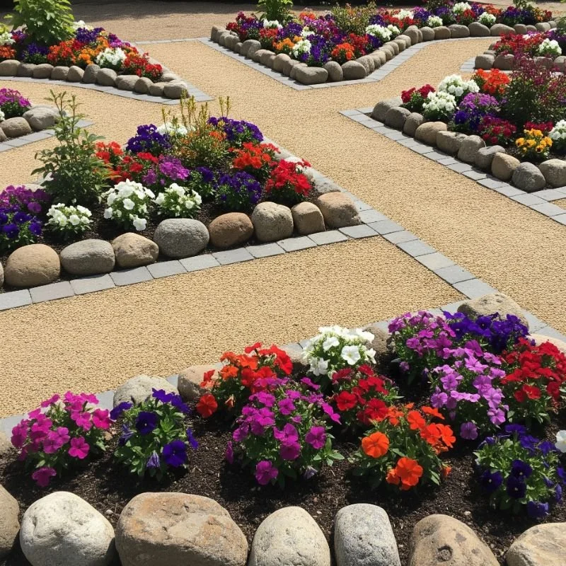 Build elevated garden beds using natural stone walls that showcase trailing and cascading flowers spilling over edges like colorful waterfalls. This approach creates excellent drainage while displaying plants at eye level where their beauty receives maximum appreciation. Fill raised beds with well-draining soil mix that supports healthy root development, then plant with trailing varieties like ivy geraniums, bacopa, or calibrachoa that create stunning cascading effects. The height variation adds dimension to flat landscapes while making garden maintenance easier on your back and knees. Stone walls provide thermal mass that helps moderate soil temperatures, extending growing seasons for tender plants. This design works particularly well near patios, walkways, or seating areas where the elevated plantings create privacy screens while providing close-up enjoyment of flower details and fragrances.