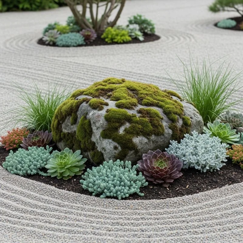 Channel tranquil Japanese garden aesthetics by combining carefully selected stones with simple, elegant plantings that emphasize form, texture, and seasonal change over busy color displays. This meditative approach uses rocks as sculptural elements alongside restrained plant choices like hostas, ferns, ornamental grasses, and carefully pruned shrubs. The emphasis falls on creating peaceful, balanced compositions where each element serves a specific purpose in the overall design harmony. Gravel paths and raked stone areas provide contemplative spaces between planted sections, encouraging slow, mindful movement through the garden. Choose plants with interesting seasonal characteristics like Japanese maples for fall color or flowering cherries for spring beauty, but keep overall plantings simple and uncluttered. This style creates calm outdoor spaces perfect for meditation, reading, or quiet reflection away from busy daily life.