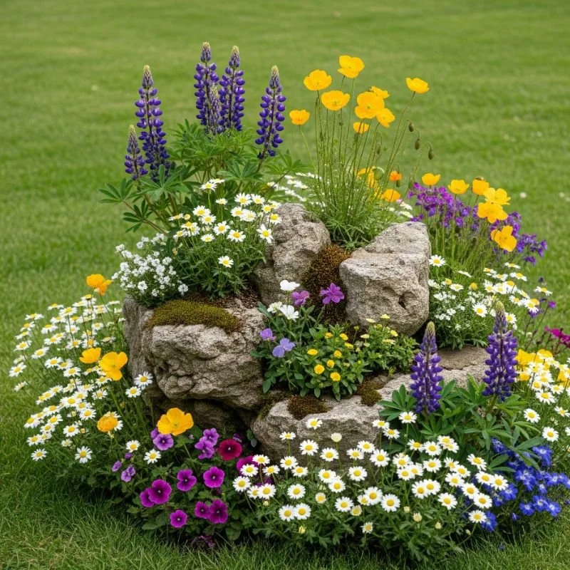 Create a mountain meadow in your backyard by combining large weathered boulders with native wildflowers that seem to emerge naturally from rocky crevices. This design mimics high-altitude landscapes where flowers adapt to harsh conditions, creating resilient beauty that requires minimal maintenance once established. Position your largest rocks first, then plant hardy perennials like alpine poppies, mountain pinks, and sedums in the spaces between stones. The contrast between rough stone textures and delicate flower petals creates visual drama that changes throughout the seasons. Native grasses and low-growing ground covers fill remaining spaces, creating a naturalistic carpet that flows around rock formations. This style works particularly well on slopes or in areas where traditional flower beds struggle to thrive.