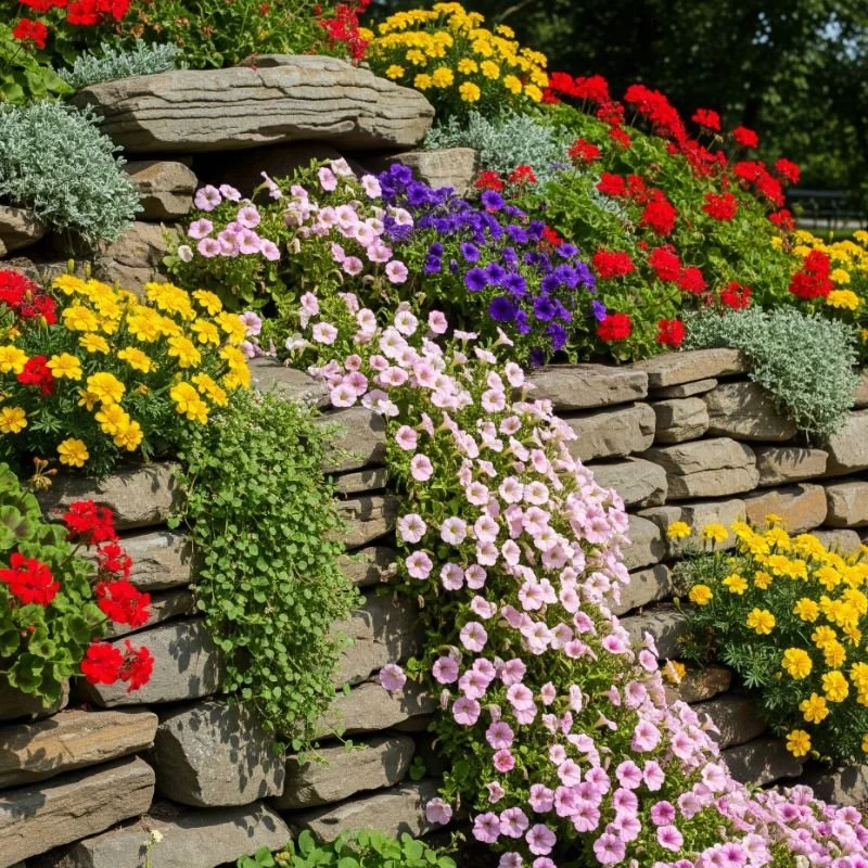 Transform challenging slopes into stunning terraced gardens by building dry-stacked stone retaining walls that create level planting areas for spectacular flower displays. These functional walls solve erosion problems while providing perfect drainage conditions that many flowering plants absolutely love. Plant cascading varieties like trailing petunias, creeping phlox, or sweet alyssum along the wall tops to soften hard stone edges with flowing color. The multiple levels create opportunities for diverse plantings, from sun-loving flowers on upper terraces to shade-tolerant plants in lower, more protected areas. Natural stone walls age beautifully, developing character as moss and small plants establish in crevices between rocks. This approach works exceptionally well for creating formal garden rooms or defining different functional areas within larger landscape designs.