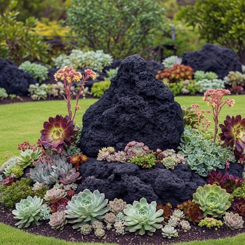 Embrace contemporary desert aesthetics by combining dramatic black or red lava rock with architectural succulent plants that create striking modern landscapes requiring minimal water and maintenance. The porous texture of lava rock provides excellent drainage while its bold color creates dramatic contrasts with succulent foliage in blues, grays, and greens. This style works particularly well in hot, dry climates or contemporary home settings where clean lines and bold forms complement modern architecture. Choose sculptural succulents like agaves, barrel cacti, or architectural aloes that provide year-round structure and occasional spectacular bloom displays. The thermal properties of dark lava rock help moderate soil temperatures while the unique texture adds visual interest that changes throughout the day as light and shadows shift. This low-maintenance approach appeals to busy homeowners who want stunning gardens without intensive care requirements.