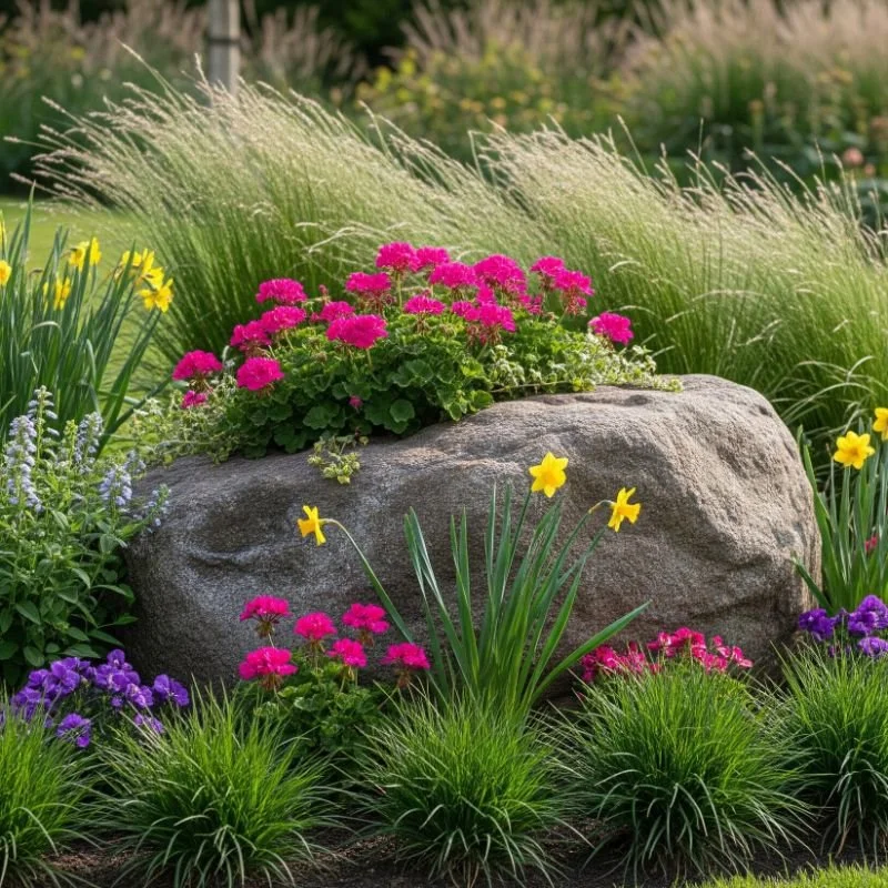 Create dramatic focal points by positioning large specimen boulders among flowing ornamental grasses and architectural plants that complement stone's solid presence with movement and texture. This contemporary approach works beautifully in modern landscapes where clean lines and bold forms take precedence over traditional flower bed styles. Choose grasses with varying heights, textures, and seasonal colors to provide year-round interest that changes with weather and light conditions. The permanent structure of boulders provides stability and visual weight that anchors lighter, more ephemeral plantings throughout the seasons. Add carefully selected flowering plants like ornamental onions, black-eyed susans, or ornamental sages that complement rather than compete with the grass and stone combination. This low-maintenance style suits busy homeowners who want maximum visual impact with minimal ongoing care requirements.