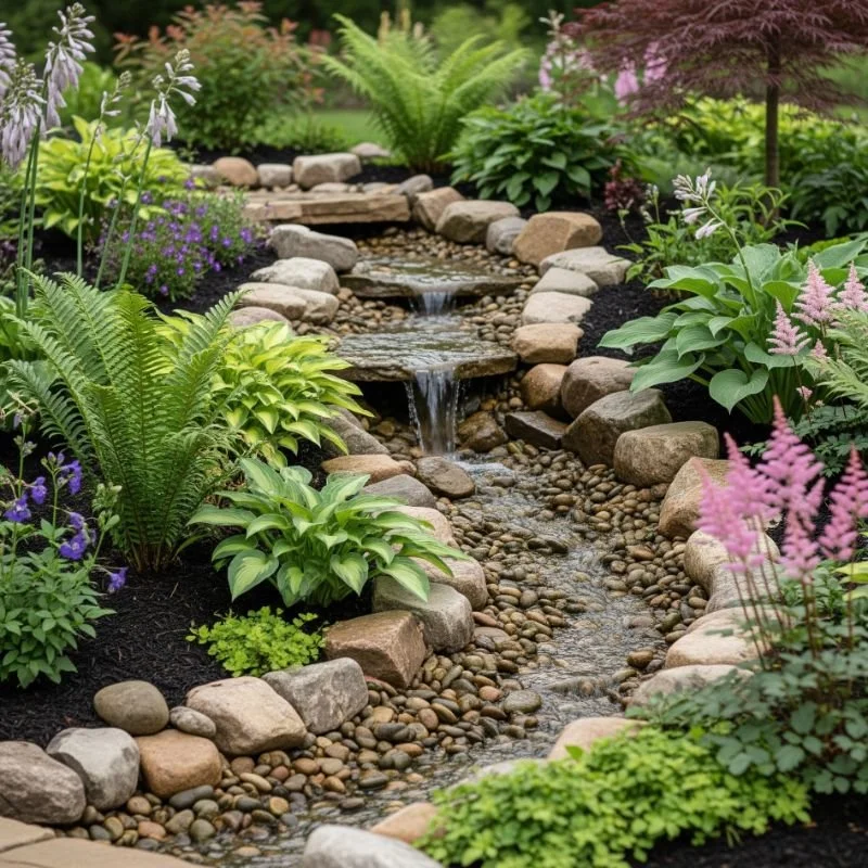 Design naturalistic water features using arranged stones to create dry creek beds that manage water runoff while supporting moisture-loving plants in surrounding bog gardens. This ecological approach mimics natural stream environments while solving drainage problems and creating unique garden habitats. Use various sized stones from large boulders to small pebbles to create realistic creek bed formations that look natural even when dry. Plant moisture-loving species like astilbe, cardinal flower, and ferns in adjacent areas that benefit from seasonal water flow and retained moisture. The dynamic interplay between stone and water creates ever-changing garden scenes that look different in various weather conditions. This approach works particularly well for managing runoff from roofs, driveways, or slopes while creating beautiful garden features that support wildlife and provide unique planting opportunities for water-loving species.