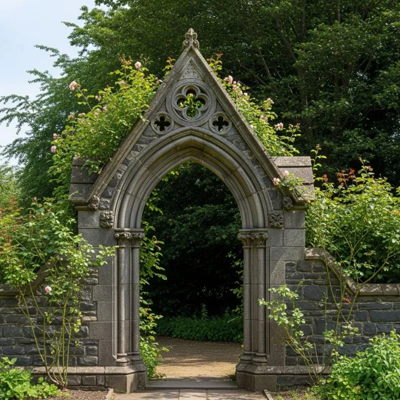 Bring dramatic flair to your landscape with Gothic-inspired pointed arches. These striking structures evoke medieval gardens and ancient ruins, adding mystery and romance to your outdoor space. The characteristic pointed tops and often elaborate tracery create strong vertical elements that draw the eye upward. Whether crafted from metal, wood, or stone, Gothic arches make bold statements that work especially well in shade gardens or as frames for garden mirrors. Their height makes them perfect for climbing roses or clematis that can reach impressive proportions. The architectural drama they provide transforms ordinary garden paths into something from a fantasy novel, especially when softened by cascading foliage.