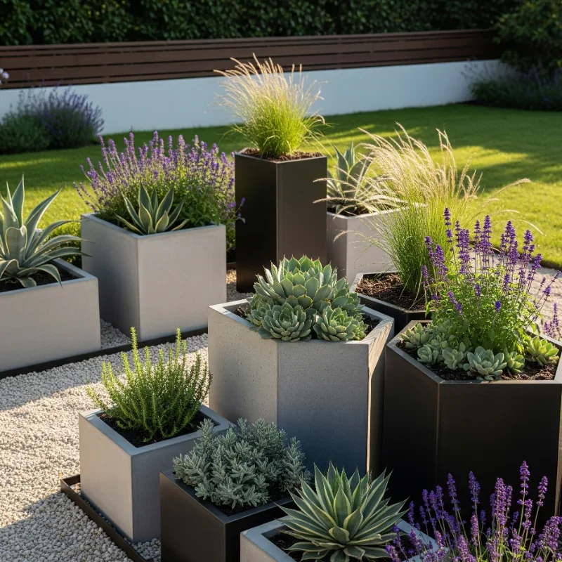 Step into the future with geometric planter boxes that turn your garden into an outdoor art gallery! These angular beauties feature clean lines, sharp edges, and contemporary shapes like hexagons, triangles, or asymmetrical designs. Crafted from materials like powder-coated steel, composite wood, or sleek fiberglass, they complement modern architecture perfectly. Imagine tall rectangular planters flanking your entrance or a cluster of different-sized cubes creating visual rhythm across your patio. The beauty lies in their versatility; paint them in bold colors for statement pieces or keep them neutral to let plants shine. Mix various heights to create dynamic landscapes that draw the eye upward. These boxes work exceptionally well with architectural plants like ornamental grasses, succulents, or structured topiary. Your outdoor space transforms into a contemporary showcase where nature meets design in perfect harmony.