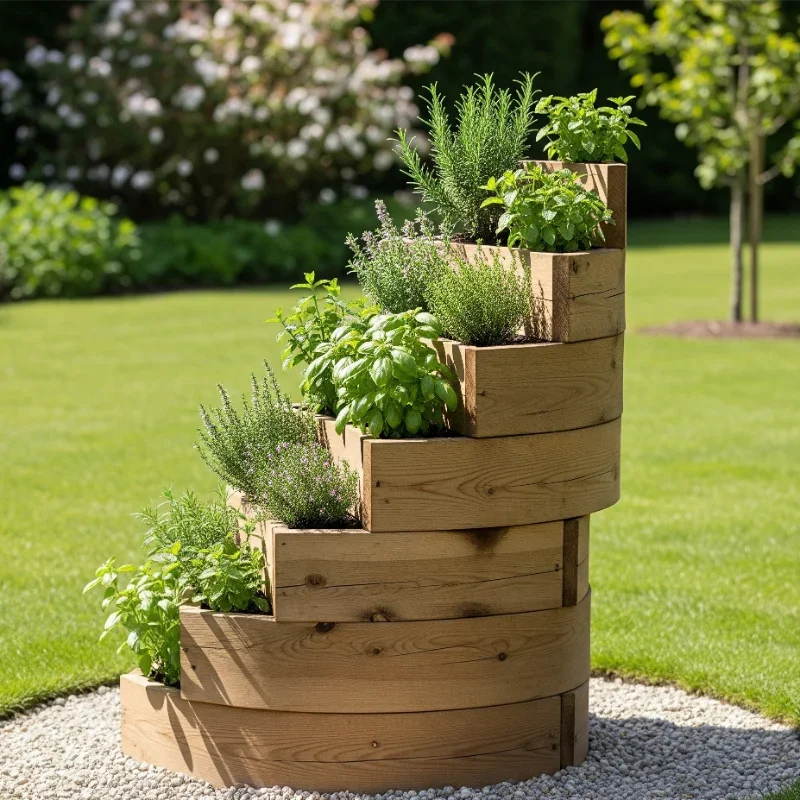 Revolutionize herb growing with spiral-shaped boxes that create multiple microclimates in minimal space! These ingenious designs use ascending spirals to provide various growing conditions from wet bottom areas to dry sunny tops. Build from stacked stones, curved wood, or metal edging filled with soil that gradually rises. Mediterranean herbs like rosemary and thyme thrive at peaks while moisture-lovers like mint and parsley flourish below. The spiral shape naturally improves drainage while making every plant accessible from ground level. This ancient permaculture technique maximizes growing space while creating stunning garden features. Position near kitchens for convenient harvesting or use as centerpieces in formal gardens. The curved lines soften landscape edges while the height adds vertical interest. Add decorative stones or mulch between plantings for finished looks. Your herbs grow better while creating living sculptures that combine function with fascinating form.