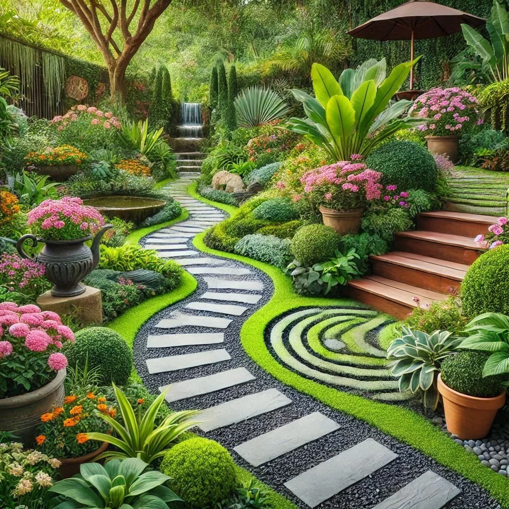 Why choose just one material when you can have the best of several? Mixed material paths offer a creative and dynamic way to design your garden walkway. By blending materials like stone, gravel, wood, and brick, you can achieve a visually striking path that combines textures, colors, and styles. This approach not only adds depth and interest but also allows you to define different areas of your garden, guiding visitors through your outdoor space in a thoughtful and unique way. Mixed material paths are highly customizable, making them ideal for showcasing your personal style and adding a touch of originality. Whether you prefer a modern, eclectic, or rustic aesthetic, this versatile option lets your garden reflect your creative vision while maintaining practicality and charm.
