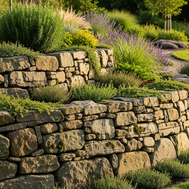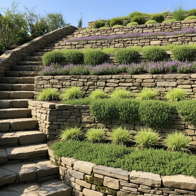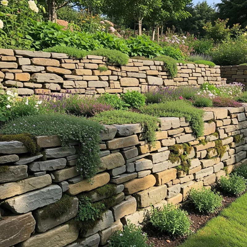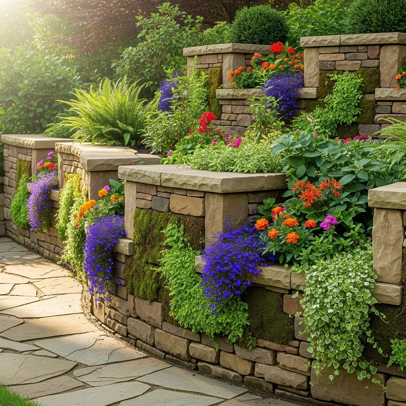 Create a cascading paradise with terraced retaining walls that transform steep slopes into productive, beautiful garden spaces. It's like turning your hillside into a giant staircase for plants! Each level becomes its own microclimate, perfect for organizing plants by water and sun requirements. The terracing reduces erosion while maximizing your usable garden space dramatically. Build lower walls for vegetables and herbs within easy reach, saving taller sections for ornamental displays. The stepped design creates natural pathways and viewing points throughout your garden. Include drip irrigation on each level for efficient watering without runoff. Materials can vary between levels for visual interest while maintaining structural integrity. The horizontal lines create a sense of calm and order in chaotic slopes. Your garden becomes a living amphitheater where every plant has its perfect stage.