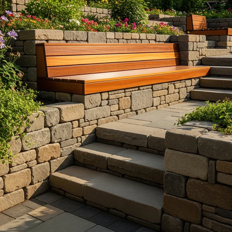 Maximize functionality with stepped retaining walls that double as garden seating for contemplation and entertainment. These multi-purpose structures are like Swiss Army knives for your landscape! Wide treads become natural benches for enjoying garden views and gathering. The stepped design reduces individual wall heights, simplifying construction requirements significantly. Each level can feature different materials or plants for varied visual interest. Built-in lighting under seating edges creates ambiance for evening garden parties. The terracing provides multiple planting opportunities at comfortable working heights. Natural stone or smooth concrete caps ensure comfortable seating surfaces. Position steps to capture best views or create intimate conversation nooks. Your retaining wall becomes a social hub that brings people into the garden.