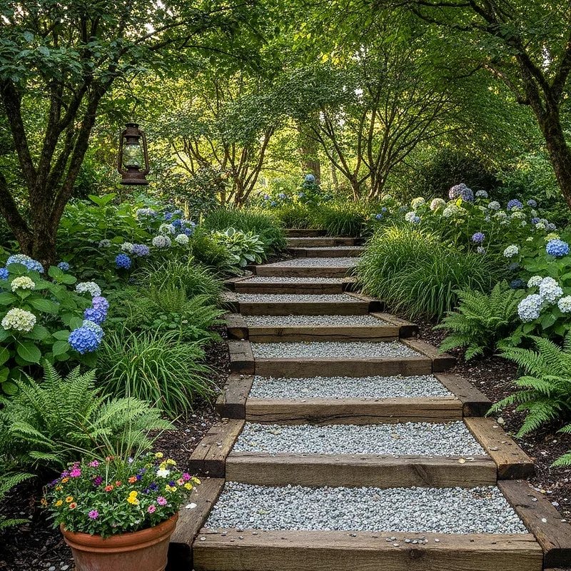 Combining gravel with timber creates dynamic steps that balance structure with natural flow beautifully. Timber risers hold the gravel treads in place while providing clear definition between each level. This combination drains exceptionally well, making it perfect for areas prone to standing water or heavy rainfall. The crunching sound of gravel underfoot adds a sensory element that enhances your garden experience. You can choose from pea gravel, crushed stone, or decomposed granite to match your aesthetic preferences. This design works wonderfully in informal gardens where a softer, less structured appearance is desired. Maintenance involves occasional gravel replenishment, but the overall upkeep remains minimal compared to other options. The contrast between smooth wood and textured stone creates visual interest at every step.