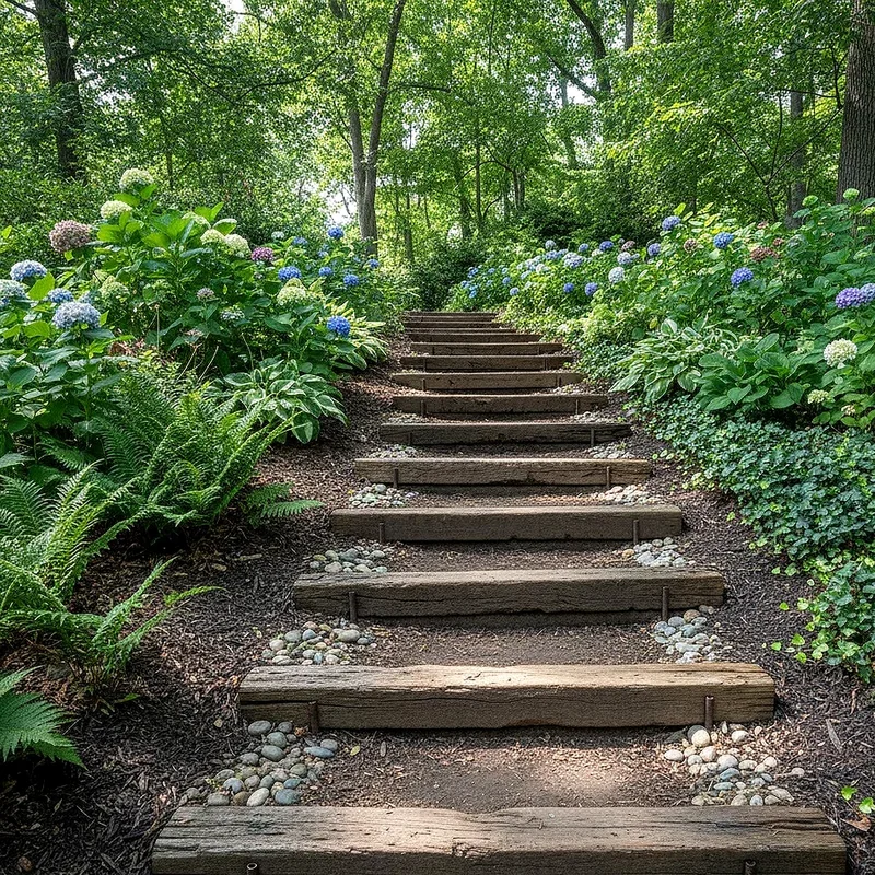 Railroad ties create incredibly robust steps that stand up to harsh weather and constant use. These massive timbers bring an industrial aesthetic that works surprisingly well in many garden settings. The dark, weathered appearance of used railroad ties adds instant character and history to your landscape. You can stack them for taller risers or use single ties for gentle grade changes. Their substantial weight means they stay firmly in place without extensive anchoring or foundation work. Railroad ties pair beautifully with gravel or crushed stone treads for a cohesive rustic look. These steps shine in larger gardens where their bold scale makes appropriate visual impact. Consider using newer, untreated timbers if you're concerned about chemical treatments from authentic railroad ties.