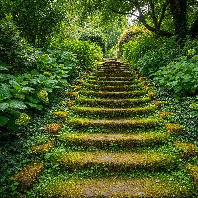 Moss covered steps transform ordinary pathways into magical, fairy tale inspired garden features that captivate visitors. The velvety green carpet softens hard surfaces while adding lush color throughout the year. Moss thrives in shady, moist conditions, making it perfect for woodland gardens or shaded slopes. You can encourage moss growth on stone or concrete by applying buttermilk or yogurt mixtures. These living steps create habitat for beneficial insects and contribute to your garden's ecological health. The slightly spongy texture provides unexpected comfort underfoot while maintaining adequate traction for safety. Moss naturally controls erosion and filters water, making your steps both beautiful and environmentally friendly. This option works best in areas with minimal foot traffic to preserve the delicate moss.
